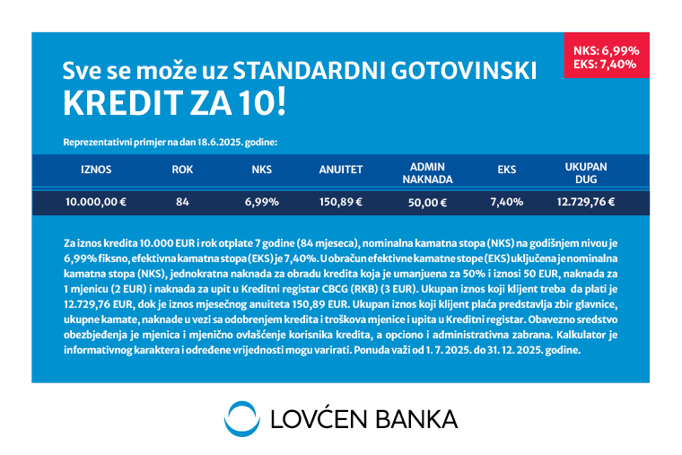 Lovćen banka ponudila je Standardni gotovinski kredit po specijalnim uslovima u iznosu od 10.000€ bez potrebe prenosa zarade u Lovćen banku. Rok otplate kredita je 7 godina, a posebna povoljnost je popust od 50% na jednokratnu naknadu za obradu kredita.