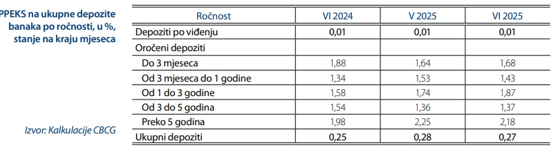 „Razlika između aktivnih i pasivnih kamatnih stopa u junu je iznosila 6,04 pp i niža je u odnosu na isti period prethodne godine kada je bila 6,36 pp, kao i u odnosu na prethodni mjesec kada je iznosila 6,06 pp“, navodi se u Biltenu CBCG.