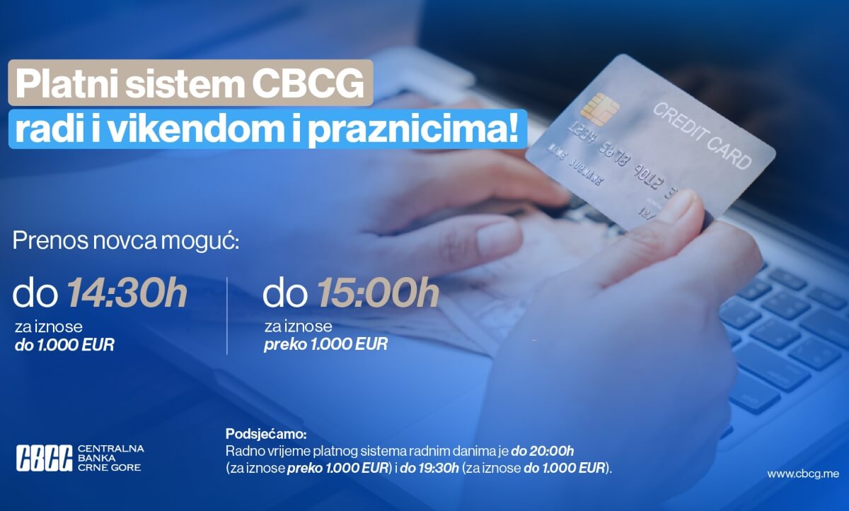 Time će građanima i privredi biti omogućeno izvršavanje novčanih transakcija i subotom, nedjeljom, kao i tokom državnih i drugih praznika, i to: do 14:30 časova za iznose do 1.000 eura, odnosno do 15:00 časova za iznose preko 1.000 eura.