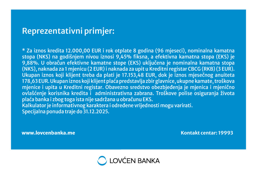 Za iznos kredita 12.000 EUR i rok otplate 8 godina (96 mjeseci), nominalna kamatna stopa (NKS) na godišnjem nivou iznosi 9,45% fiksna, a efektivna kamatna stopa (EKS) je 9,88%. U obračun efektivne kamatne stope (EKS) uključena je nominalna kamatna stopa (NKS), naknada za 1 mjenicu (2 EUR) i naknada za upit u Kreditni registar CBCG (RKB) (3 EUR). Ukupan iznos koji klijent treba da plati je 17.153,48 EUR, dok je iznos mjesečnog anuiteta 178,63 EUR. Ukupan iznos koji klijent plaća predstavlja zbir glavnice, ukupne kamate, troškova mjenice i upita u Kreditni registar. Obavezno sredstvo obezbjeđenja je mjenica i mjenično ovlašćenje korisnika kredita i administrativna zabrana. Troškove polise osiguranja života plaća banka i zbog toga ista nije sadržana u ovom obračunu EKS. Kalkulator je informativnog karaktera i određene vrijednosti mogu varirati.