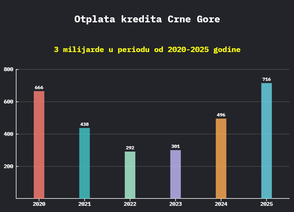 Crna Gora je od 2020. do 2025. iz budžeta otplatila oko tri milijarde eura ranije preuzetih obaveza, pokazuje nova analiza organizacije MneStat. Uprkos visokim otplatama, nominalni javni dug ostaje oko 4,7 milijardi eura, jer su dio obaveza zamijenila nova zaduženja iz prethodnih godina.