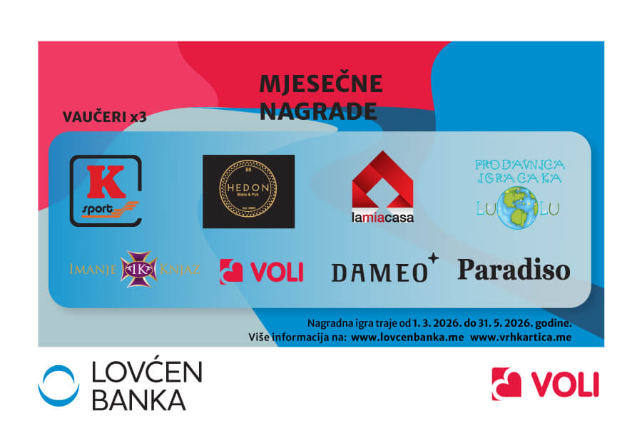 U periodu od 1. 3. 2026. do 31. 5. 2026. godine, korisnici koji obave najmanje jednu transakciju (kupovinu) VISA VRH debitnom karticom, izdatom od strane Lovćen banke, u iznosu od najmanje 30 EUR ili više, jednokratno ili na rate, na prodajnim mjestima u zemlji, inostranstvu, ili online imaju mogućnost da osvoje neku od vrijednih nagrada.